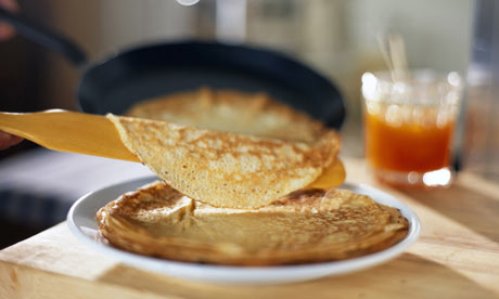 My late dad's pancake recipe is so simple that even my four-year-old nephew, who wolfed down a few with me on Sunday, has got the knack: on the assumption that one egg makes three pancakes, whisk eggs and enough milk to make a nice thin liquid, then thicken to the consistency of double cream by adding three heaped tablespoons of plain flour for each egg used, working slowly to keep the batter smooth, and adding dashes of milk to keep from being too thick. Delia dilutes the milk with water - up to you, really - but as a twist, buttermilk adds a really nice tang to the taste. Use a small non-stick pan ever so lightly greased, heat the pan on high, then turn the heat down before ladling in enough batter to coat the bottom of the pan, not turning it over until the underside comes together (in a matter of minutes). Having tried out a French-style crepe maker, I'm now smitten with them for ease and the perfection of a round pancake, particularly when doing big family batches - it avoids those flipping disasters.